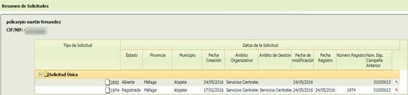 Si se pulsa sobre el botón que se encuentra a la derecha de los datos (o bien “doble clic” sobre cualquiera de los campos que componen el registro que se precise visualizar), abrirá dicha solicitud.