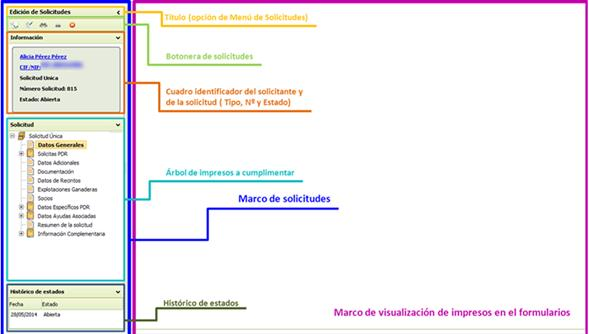 -Marco de Solicitudes: Es el Área de consulta de solicitudes del tipo seleccionado para un determinado productor consultado y donde se muestran los impresos que habrá que cumplimentar. Se compone de los siguientes elementos: