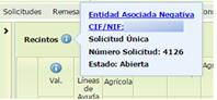 oInformación: Presenta la identificación del Solicitante (con Nombre y Apellidos, y CIF/NIF), se encuentra resaltada en azul y subrayada; con un clic sobre cualquiera de ellas visualiza el Resumen de Solicitudes para ese CIF/NIF. Respecto de la solicitud indica el tipo, número y el estado de tramitación en el que se encuentra.