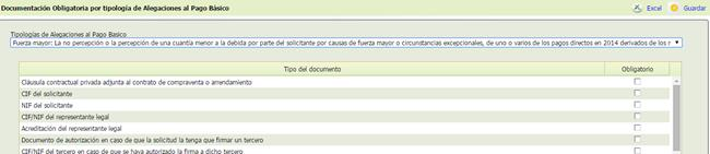 - [Obligatorio]: casilla de verificación para marcar aquellos documentos que serán obligatorios para la Alegación al Pago Básico seleccionada.