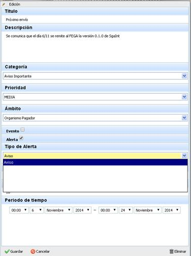 4. En el cuadro de diálogo se podrá realizar modificaciones del aviso e incluso eliminarlo.