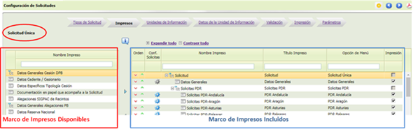 3. Desde el Marco de Impresos Disponibles, se podrá seleccionar un determinado impreso (haciendo clic con el ratón en el botón izquierdo) y mediante el botón el impreso pasará a formar parte de la solicitud, y se visualizará en el Marco de Impresos Incluidos.