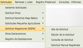 4.1.1.4 Solicitud Alegaciones SigPac En el opción de Solicitudes Alegaciones SigPac se encuentran agrupadas las operaciones relacionadas con la solicitud específica de Alegaciones al SigPac.