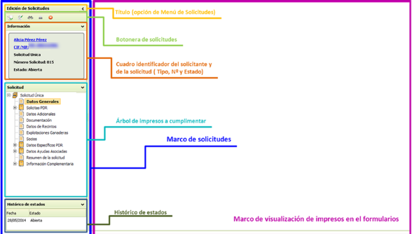 - Marco de Solicitudes: Es el Área de consulta de solicitudes del tipo seleccionado para un determinado productor consultado y donde se muestran los impresos que habrá que cumplimentar. Se compone de los siguientes elementos:
