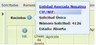 o Información: Presenta la identificación del Solicitante (con Nombre y Apellidos, y CIF/NIF), se encuentra resaltada en azul y subrayada; con un clic sobre cualquiera de ellas visualiza el Resumen de Solicitudes para ese CIF/NIF. Respecto de la solicitud indica el tipo, número y el estado de tramitación en el que se encuentra.