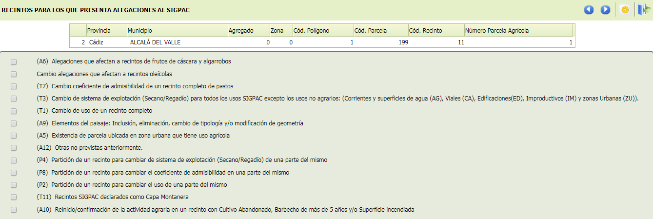 que aparece en el campo “Datos Alegaciones” de un recinto, se accede a la pantalla con las posibles alegaciones al SIGPAC para ese recinto.