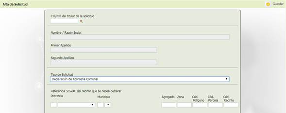 En el formulario de alta se selecciona en el campo Tipo de solicitud: “Declaración de Aparcería Comunal” y además del CIF/NIF, Nombre y Apellidos del declarante se requiere la cumplimentación de la referencia SIGPAC válida del recinto que se desea declarar: