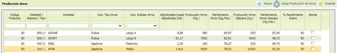 - [Producción Arroz Cáscara (Kg)]: producción de arroz con cáscara obtenida en kilogramos de esa Variedad-Tipo-Subtipo. Campo obligatorio y editable