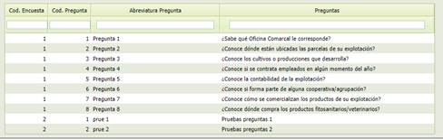 En el apartado “Preguntas” se mostrarán los campos de código de encuesta, código de pregunta, abreviatura pregunta y preguntas.