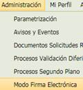 4.1.8.15 Modo Firma Electrónica Se definen los Modos de Firma Electrónica. Se accede seleccionando la sexta opción del menú Administración.