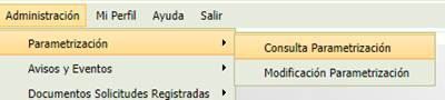 Dentro de la opción de Parametrización y según el perfil de usuario o ámbito organizativo, al posicionarnos en la opción de menú Parametrización aparecerán las opciones ‘Consulta Parametrización’ y/o ‘Modificación Parametrización’ hay dos submenús, dependiendo del perfil del usuario podrá ver ambos submenús o solo el de Consulta: