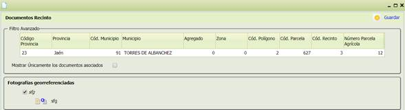 Permitirá asociar (o desasociar) un documento al recinto pulsando el botón Guardar. Se actualizará está información en el formulario anterior.