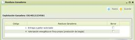 - [Residuos Ganaderos]: Botón que abrirá un formulario donde declarar de una lista de valores el uso de los residuos ganaderos de la explotación