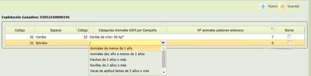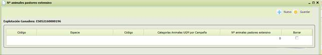 - [Borrar]: Casilla de verificación para poder señalar la explotación las especies que no realizarán pastoreo extensivo.