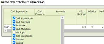 - [Cód. de Explotación]: Código de identificación de la explotación ganadera. Tiene 14 posiciones. Se compone de las letras ES más doce dígitos (2 dígitos para el código INE de la provincia + 3 dígitos para código INE del municipio + 7 dígitos que identifican la explotación dentro del municipio)