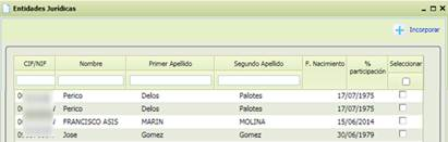 3. Aparecerán en la pantalla de Datos de socios y se terminará de rellenar la información de porcentaje de participación, si es Agricultor no pluriactivo y si es Joven Agricultor.