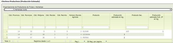Se podrá rellenar el campo [Producción estimada en Kg.], y/o [Producción estimada Cult. 2ª en Kg.] del producto que corresponde con ese recinto y que irá destinado a esa OPFH, incluido el valor = 0 y se dará al botón