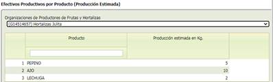 En la zona inferior, al seleccionar una de las organizaciones que muestra el listado del combo de selección saldrán los productos declarados asociados a esa categoría