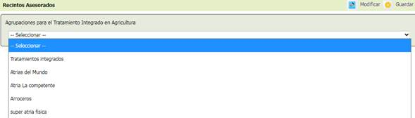 En esta pantalla se seleccionarán los recintos asesorados por cada ATRIA. Primero se selecciona la ATRIA:
