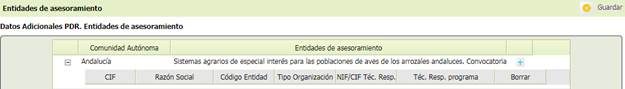 Permite incorporar los datos de las entidades de asesoramiento en los casos en que el solicitante haya marcado en las casillas de verificación del impreso de Solicitas de Desarrollo Rural la línea de ayuda de la medida “Agroambiente y clima” y/o “Agricultura ecológica (y las equivalentes de periodos anteriores) para la que es obligatorio rellenar este campo.