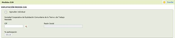 Permite recoger datos específicos de la Medida 13 / Intervención 661: Agricultor individual y Porcentaje y CIF de la Sociedad Cooperativa de Explotación Comunitaria de la Tierra o de Trabajo Asociado para las líneas de zonas con limitaciones naturales (ZLN).