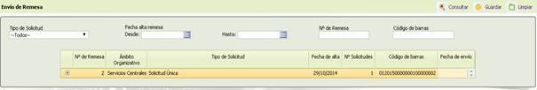 - [Fecha de envío]: fecha de envío de la remesa. Para poder enviar una remesa habrá que insertar un valor en dicho campo. La fecha de envío no podrá ser anterior a la fecha de finalización de ninguna solicitud de la remesa.