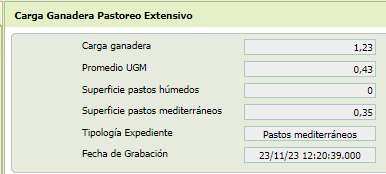 - [Carga Ganadera] Resultado de la carga ganadera, con dos decimales, expresa el promedio de UGM’s calculado para el productor dividido por la suma de la superficie (ha) declarada de pasto en su solicitud.