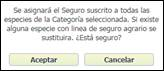 se le asignará la línea de Seguro Suscrito seleccionada a todas las especies de la categoría seleccionada, avisando de que si las especies ya tienen una línea de seguro seleccionada está se le modificará por la nueva con el siguiente mensaje: