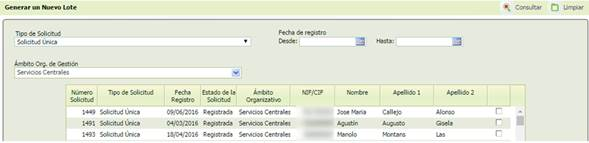 “Consultar”, que se encuentra a la derecha del título del formulario o la tecla “Enter”. Como resultado de esta consulta, se muestra el listado de las solicitudes registradas por ese ámbito organizativo y que están listas para entrar en un lote, así como una serie de datos mínimos de las mismas. Presenta la información de la siguiente forma: