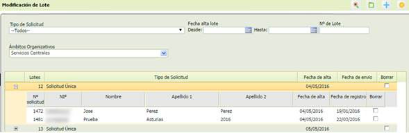 : permite desplegar/plegar la información sobre las solicitudes incluidas en un registro de lote concreto. Tras la línea de información del lote se despliega la misma información de las solicitudes registradas que se ha detallado en Funcionalidades: Generar Lotes, excepto el Tipo y estado de la solicitud, e incluyendo el campo de [Fecha de alta]