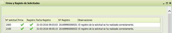 , se clicarán aquellas solicitudes que se quieran firmar y registrar, se dará al botón