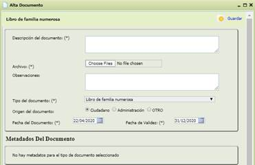 de aquel documento que es necesario dar de alta en el Gestor documental. Abre un formulario en el que se muestra qué información hay que aportar para realizar el alta del documento.