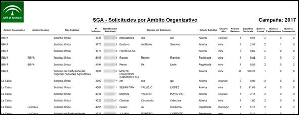 Ambito Organizativo, Ambito de Gestión, Tipo de solicitud, Nº de solicitud,Identificación del solicitante, Datos del Solicitante, Estado de la Solicitud, Usuario de Alta,Número de Recintos, Superficie Declarada, Número de Líneas, Número de Explotaciones, Número de Documentos.