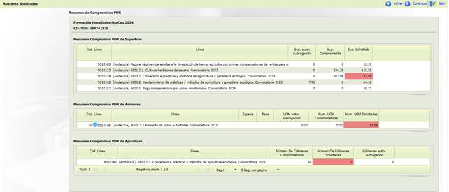 · Si el titular tiene datos de compromisos, se mostrará los resúmenes de compromisos de PDR mostrando en Rojo en el caso de que lo solicitado sea menor que lo comprometido.