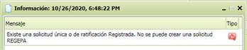 Si ya existiera una Solicitud Única o de Ratificación registrada en esa campaña para ese usuario y no se ha dado de baja después en SgaGst, no se podrá crear una solicitud REGEPA si en Parámetros de la aplicación tiene activo el parámetro “[No permitir Solicitudes de REGEPA si ha presentado Solicitudes de Ayuda]” y mostrará el siguiente mensaje: