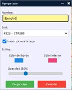 Al pulsar después el icono “Agregar nueva capa” se mostrará un explorador para poder buscar el archivo a cargar. Una vez seleccionado el archivo en el explorador, se muestra la siguiente pantalla para configurar la capa que se va a cargar: nombre con el que va a aparecer la capa en el componente gráfico, sistema de referencia de la capa y estilo de visualización de la mismaUna vez cargada la capa, se mostrará como una más de las disponibles en el desplegable de capas del componente gráfico