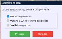 : teniendo seleccionada una geometría de la capa de edición, permite copiar una geometría desde otra capa que se seleccionará desde el listado que se muestra a la izquierda del panel de leyenda. Si ya existiese una geometría se tienen tres opciones: unir ambas geometrías, quitar la geometría copiada a la existente o sustituir la existente por la copiada.