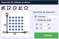 El nº de árboles a insertar en el área definida previamente podrá indicarse bien poniendo su cantidad total o las distancias entre ellos (permite decimales).
