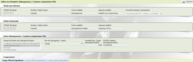 El campo “Código de subrogación” aparece para autorizaciones de Subrogaciones / Cesiones de compromisos PDR confirmadas siempre que se haya parametrizado para que se muestre.