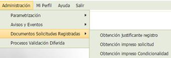 Permite realizar una consulta de aquellas solicitudes registradas que no tienen el justificante de registro asociado a la solicitud y se podrá generar el justificante y asociarlo. Se accede seleccionando la tercera opción del menú y la primera subopción