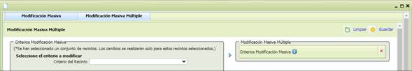 En “Modificación Masiva” de un solo dato, el combo [Criterio del Recinto]: se despliega una lista de valores con aquellos campos definidos en un recinto para los cuales se puede hacer un cambio masivo. Los valores que lo componen son: