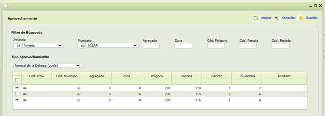Se insertarán los recintos seleccionados tras filtrar y se le asignará el Tipo de aprovechamiento seleccionado.
