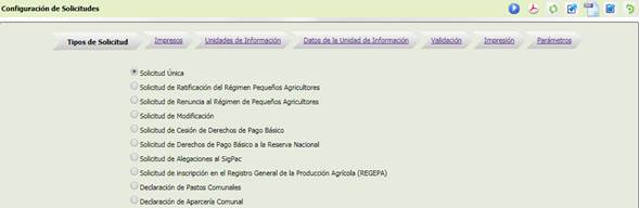 1. Se selecciona la opción de menú y se abrirá el formulario inicial de Configuración de Solicitudes, compuesto por la relación de Tipos de Solicitud.